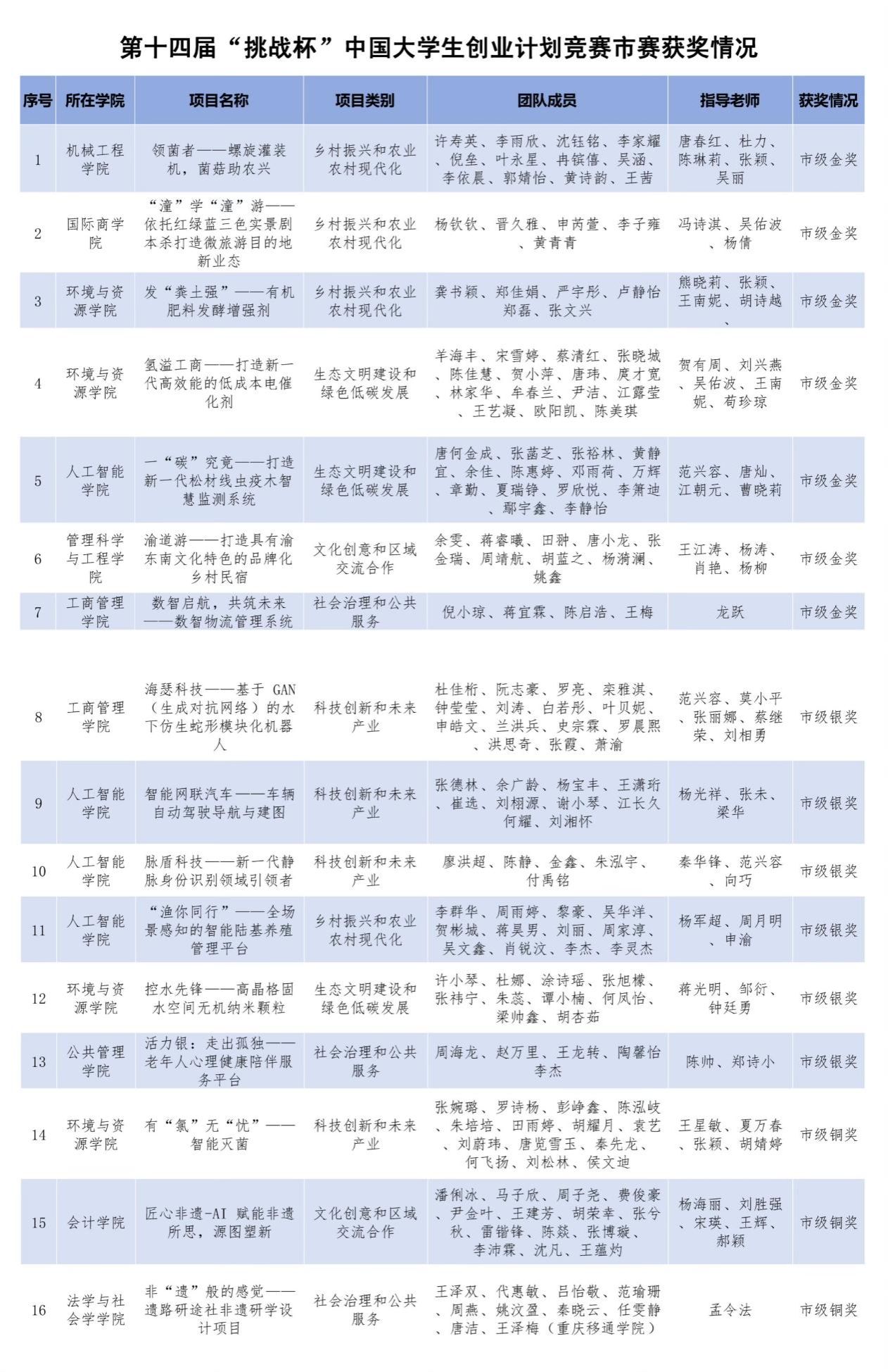 近日,由团市委、市教委、市人力社保局、市科协、重庆社科院和市学联共同举办的第十四届“挑战杯”中国大学生创业计划竞赛重庆市选拔赛获奖情况公布,金年会获7项金奖、6项银奖和3项铜奖。同时,金年会荣获“优秀组织奖”,王江涛等25位指导教师获评“优秀指导教师”,校团委袁影获评“先进工作者”。