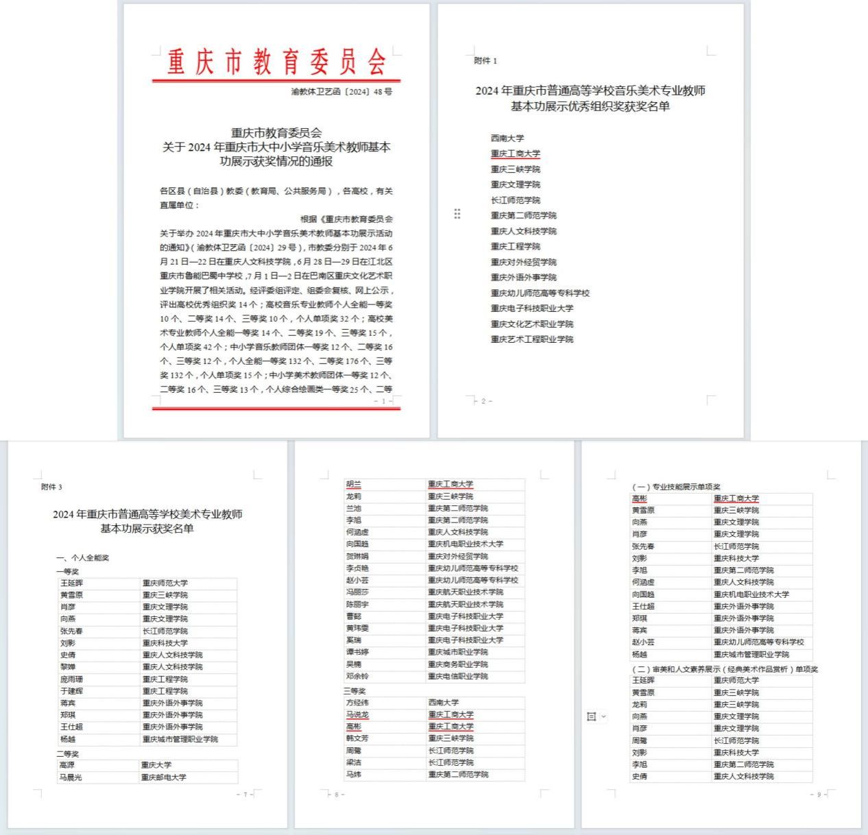近日,重庆市教育委员会公布了2024年重庆市大中小学音乐美术教师基本功展示获奖名单。金年会艺术学院教师胡兰荣获个人全能奖二等奖,马说龙、高彬荣获个人全能奖三等奖,高彬另获单项奖,学校获得“优秀组织奖”。