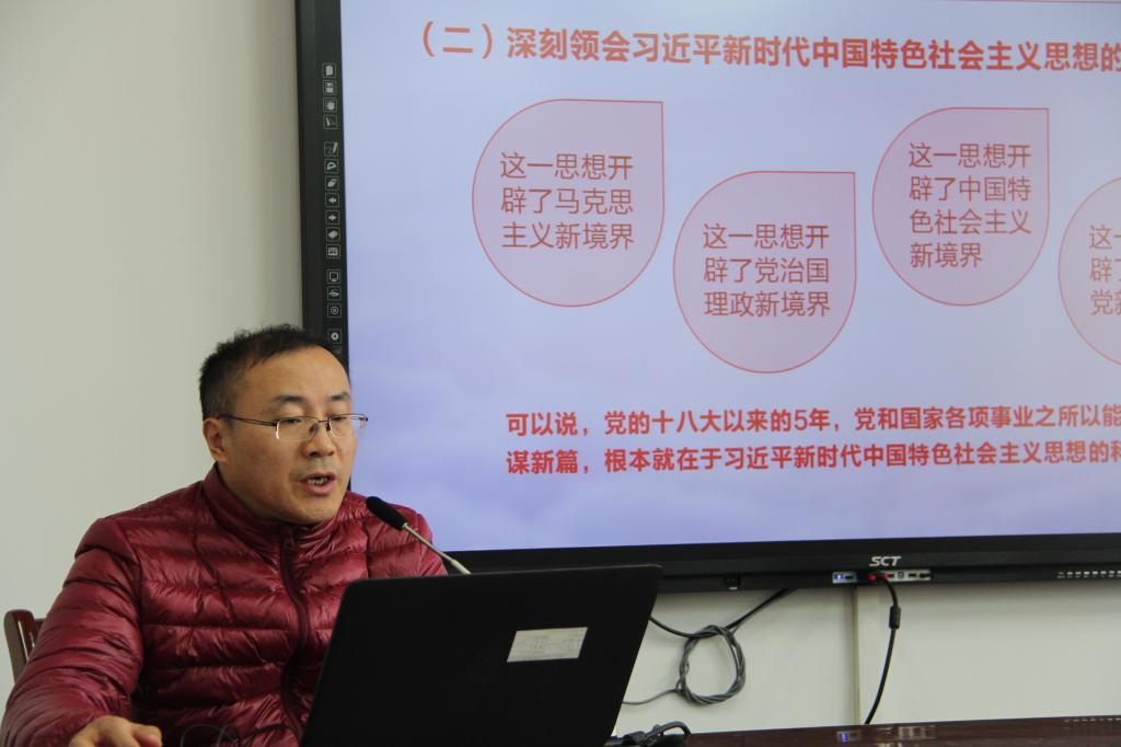 陈书记以题为《决胜全面建成小康社会 夺取新时代中国特色社会主义伟大胜利》进行了宣讲。主要围绕党的十九大的主题、主要成果;习近平新时代中国特色社会主义思想历史意义、科学内涵;过去5年的历史性成就和历史性变革;中国特色社会主义进入新时代的深刻内涵;我国社会主要矛盾的变化;两个一百年奋斗目标的战略部署;我国经济社会发展重大战略部署及坚定不移推进全面从严治党等八个方面的内容进行了详细阐释。并指出十九大是我党在决胜全面建成小康社会的重要阶段召开的一次盛会,全体思政课教师要认真学习领会十九大精神内涵,并把学习十九大精神作为今后一个时期的一项重要政治任务。