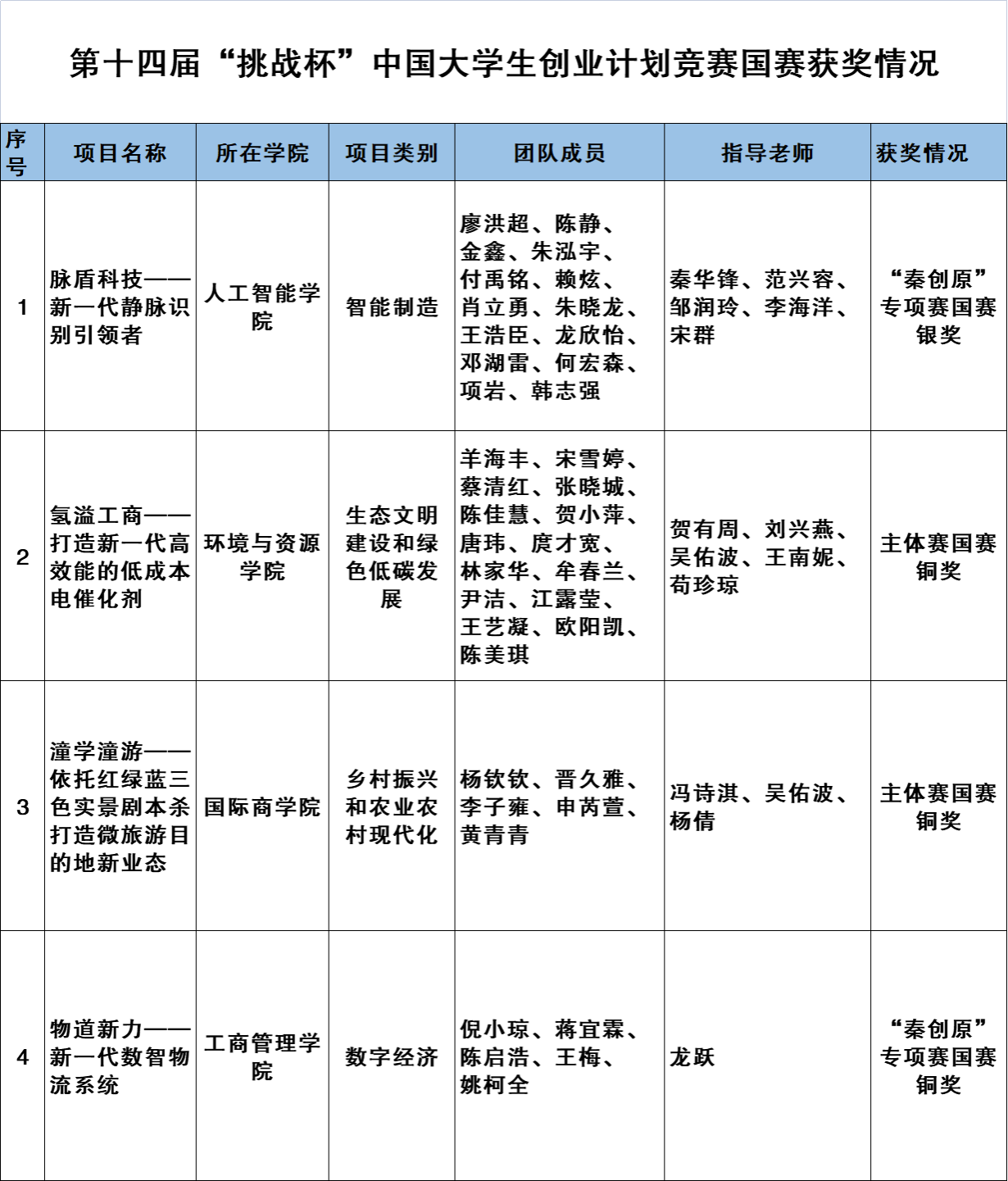 10月29日-11月2日,由共青团中央、教育部、人力资源社会保障部、中国科协、全国学联、陕西省人民政府联合主办,由西安交通大学、共青团陕西省委承办的第十四届“挑战杯”中国大学生创业计划竞赛在西安交通大学(兴庆校区)举行。经过层层角逐,金年会参赛项目获国赛银奖1项、铜奖3项。人工智能学院项目《脉盾科技-新一代静脉识别引领者》获“秦创原”创新挑战专项赛国赛银奖,环境与资源学院项目《氢溢工商一打造新一代高效能的低成本电催化剂》、国际商学院项目《潼学潼游—依托红绿蓝三色实景剧本杀打造微旅游目的地新业态》获主体赛国赛铜奖,工商管理学院项目《物道新力——新一代数智物流系统》获“秦创原”创新挑战专项赛国赛铜奖。
