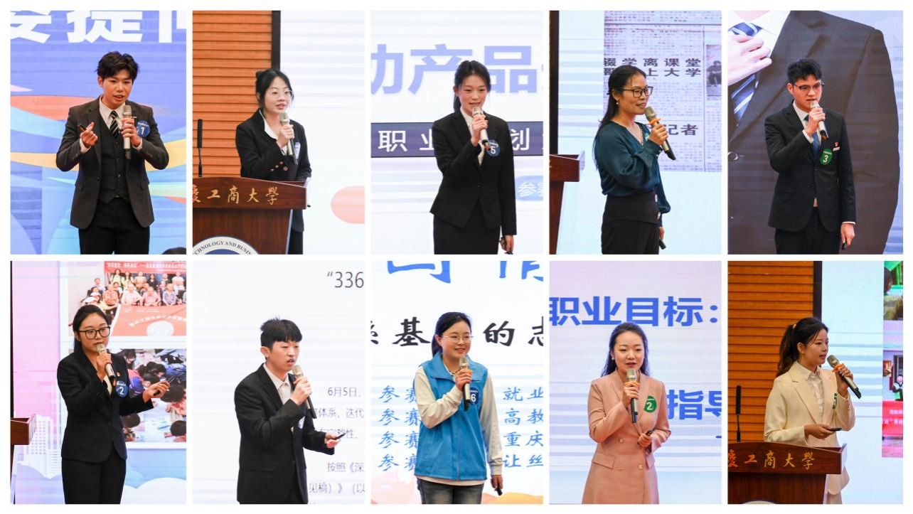 决赛邀请重庆移通学院副校长陈仲华、重庆交通大学招生就业处处长王辉、重庆汇博招聘总经理卿优,以及宗申产业集团人力资源副总裁陆箐、招商银行重庆分行人力资源部副总经理王肖潇担任主评委。还邀请了赛力斯集团股份有限公司、重庆龙湖地产发展有限公司、重庆京东方光电科技有限公司、德勤华庆商务服务有限公司、重庆传音通讯技术有限公司、中国人民财产保险股份有限公司重庆分公司、小米之家商业有限公司、重庆新东原物业管理有限公司、重庆江小白酒业有限公司、心田花开教育咨询有限公司等10家企业招聘负责人作为“企业评委”来到现场选贤纳才。同时,现场有20名由各学院教师代表组成的“大众评委团”进行现场投票。活动首次面向全校学生开启了线上直播,共计1100余名学生线上观赛。