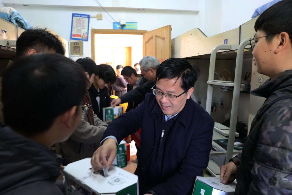 曾维伦、李国军一行来到同学们中间,与他们亲切交流,并祝大家新年快乐。在交谈过程中,校领导详细询问同学们的学习生活情况、假期安排等。在场学生分享了自己在大学期间的收获和成长。曾维伦表示,学校是一个温暖的大家庭。一直以来,学校都开展送温暖活动,走访慰问学生,关心关爱学生学习生活,充分体现学校党委对同学们的关怀和慰问。校领导鼓励大家一定要努力学习,争取在期末考试中取得好成绩;在大学期间要提升专业技能、提高自身素质,勇于克服困难、乐观面对生活,在新的一年再接再厉取得更大进步。一句句饱含真情的话语,一声声传递祝福的问候,一份份温暖如家的关怀,让在场学生感受到浓浓的暖意。
