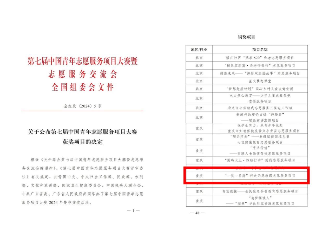 近日,由共青团中央、中央社会工作部、民政部、水利部、文化和旅游部、国家卫生健康委员会、中国残疾人联合会和中共广东省委、广东省人民政府共同主办的第七届中国青年志愿服务项目大赛暨2024年志愿服务交流会在广东汕头落幕。本次大赛聚焦科技创新、乡村振兴、绿色发展、社会服务等青年志愿服务工作重点领域,共评出金奖项目151个、银奖项目350个、铜奖项目500个。金年会《“一院一品牌”行走的思政课志愿服务项目》(申报单位:校团委、校青年志愿者协会)获第七届中国青年志愿服务项目大赛全国铜奖。