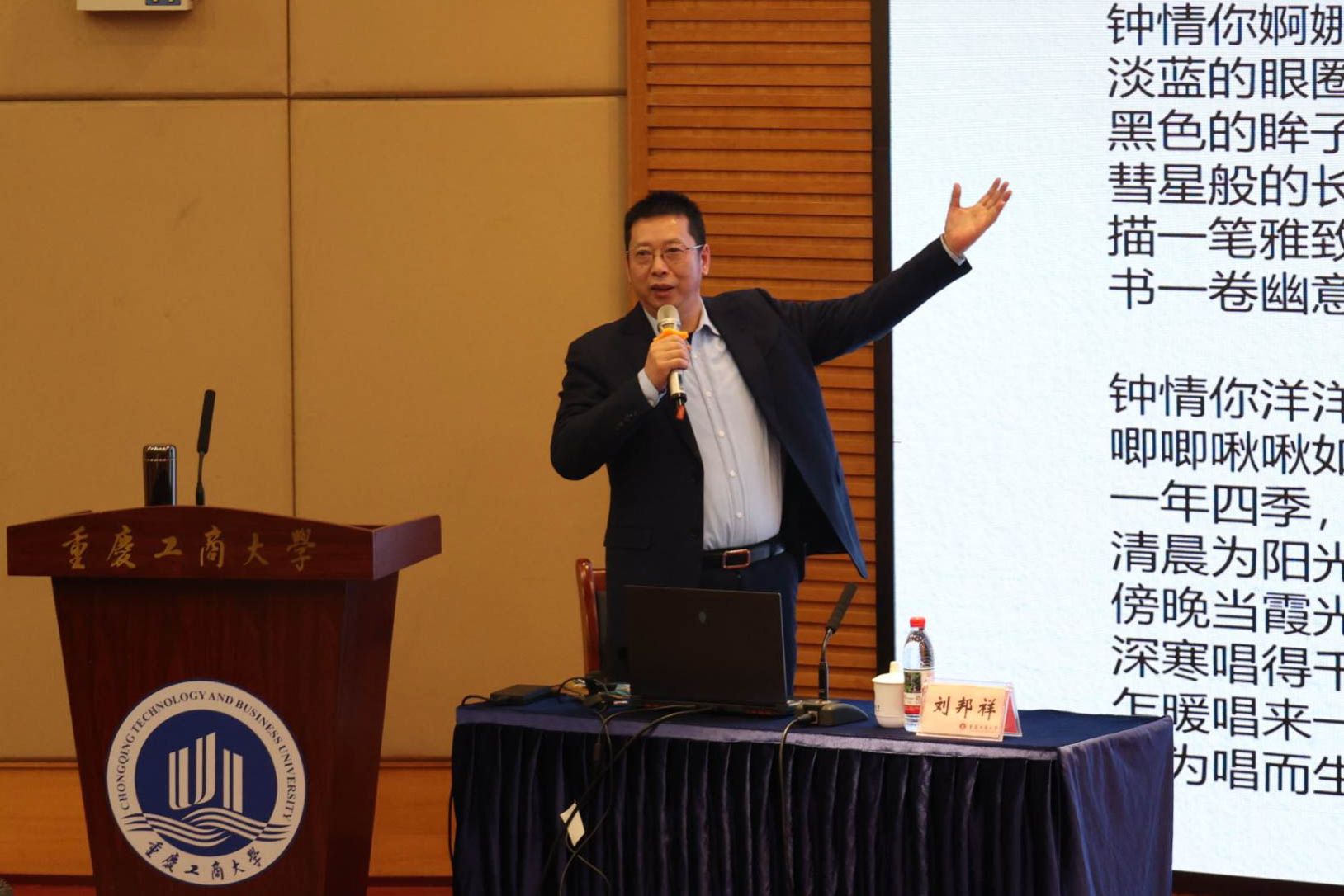 刘邦祥通过《爸爸的寿斑》《抚伤》等诗作,讲述生命之珍贵与人性之温暖,以“亿分之八”的概率比喻生命诞生的奇迹,引导学生敬畏生命、感恩亲情;从《曾家山的秋·煤矿记忆》《农民工》切入,生动展现城市化进程中建设者的奋斗史诗,指出新时代文艺工作者当以人民为创作中心;依托《画眉吟》《乌云》等诗作,深入解析自然意象中蕴含的哲学思考;结合《永不凋零的花朵——写给江竹筠》《春回》等诗作,诠释革命先烈的信仰之火,深刻阐释“文艺作品要有血有肉有灵魂”的创作真谛,希望青年学子学史明理,坚定理想信念,将个人的命运与国家的发展紧密相连。