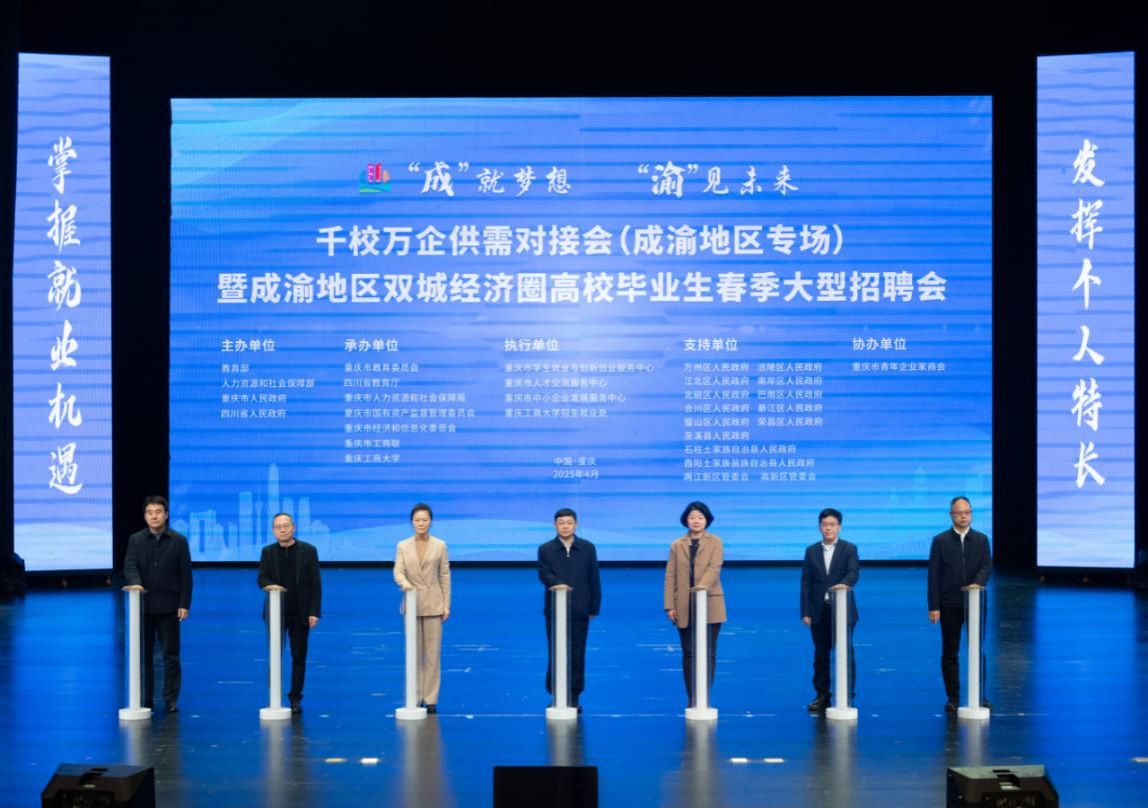 4月3日,由教育部、人力资源社会保障部、四川省人民政府、重庆市人民政府联合主办的“千校万企供需对接会”(成渝地区专场)暨“成就梦想 渝见未来”成渝地区双城经济圈高校毕业生春季大型招聘会在金年会南岸校区与西南石油大学新都校区同步启动。教育部党组成员、副部长熊四皓,四川省人民政府副省长、党组成员左永祥出席活动并致辞。重庆市政府副秘书长凌凡,市委教育工委委员、市教委副主任蒋云芳,市人力社保局党组成员、副局长苏静,市经信委二级巡视员张玻,市国资委二级巡视员罗旭,市工商联经济部一级调研员刘晓斌,金年会党委书记曾维伦,党委常委、副校长李国军在金年会图书馆剧场出席启动仪式。曾维伦作交流发言。来自南岸区等七个区(县)有关部门负责人,重庆大学等主城区33所高校的分管校领导及就业部门负责人,企业代表、学生代表共500余人参加本场启动仪式。