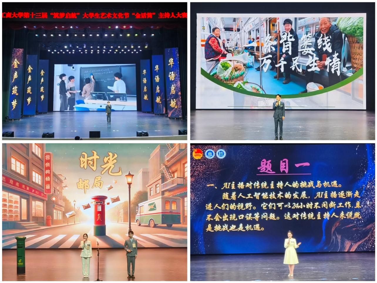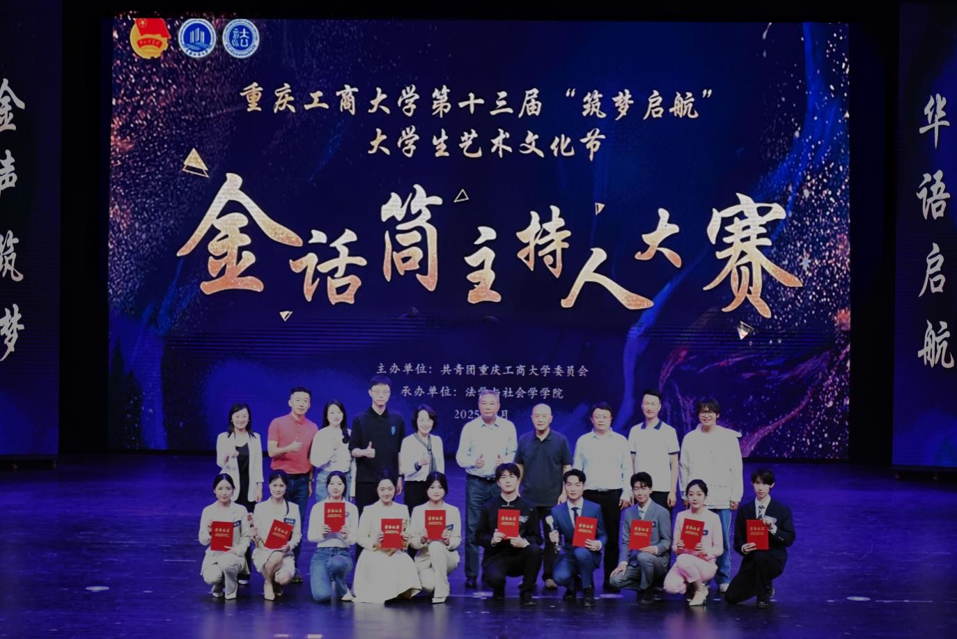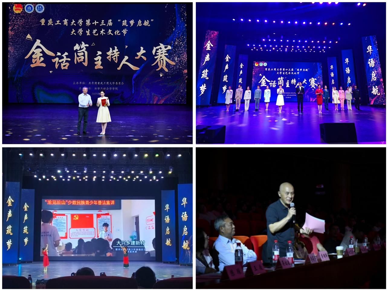 4月18日,由校团委主办、法学与社会学学院承办的JINNIAN金年会第十三届“筑梦启航”大学生艺术文化节“金话筒”主持人大赛决赛在南岸校区图书馆剧场顺利举办。学校党委常委、副校长李国军,校团委书记吴佑波,副书记王微,法社学院班子成员到场参加。重庆广电集团主任播音员、重庆市电视艺术家协会播音主持专委会主任、“学习强国”学习平台播音朗诵专家团成员祝克非,四川外国语大学新闻传播学院播音与主持艺术系主任、重庆市沙坪坝区哲学社会科学智库特聘研究员林玉佳,重庆广播电视集团(总台)主持人、重庆市广播电视十佳主持人、重庆市电影家协会语言声音艺术专委会理事张枫若,国家二级播音员、渝中区团区委特约评委周黎,JINNIAN金年会语言艺术分团指导老师江蕊弘等5名专家担任评委。