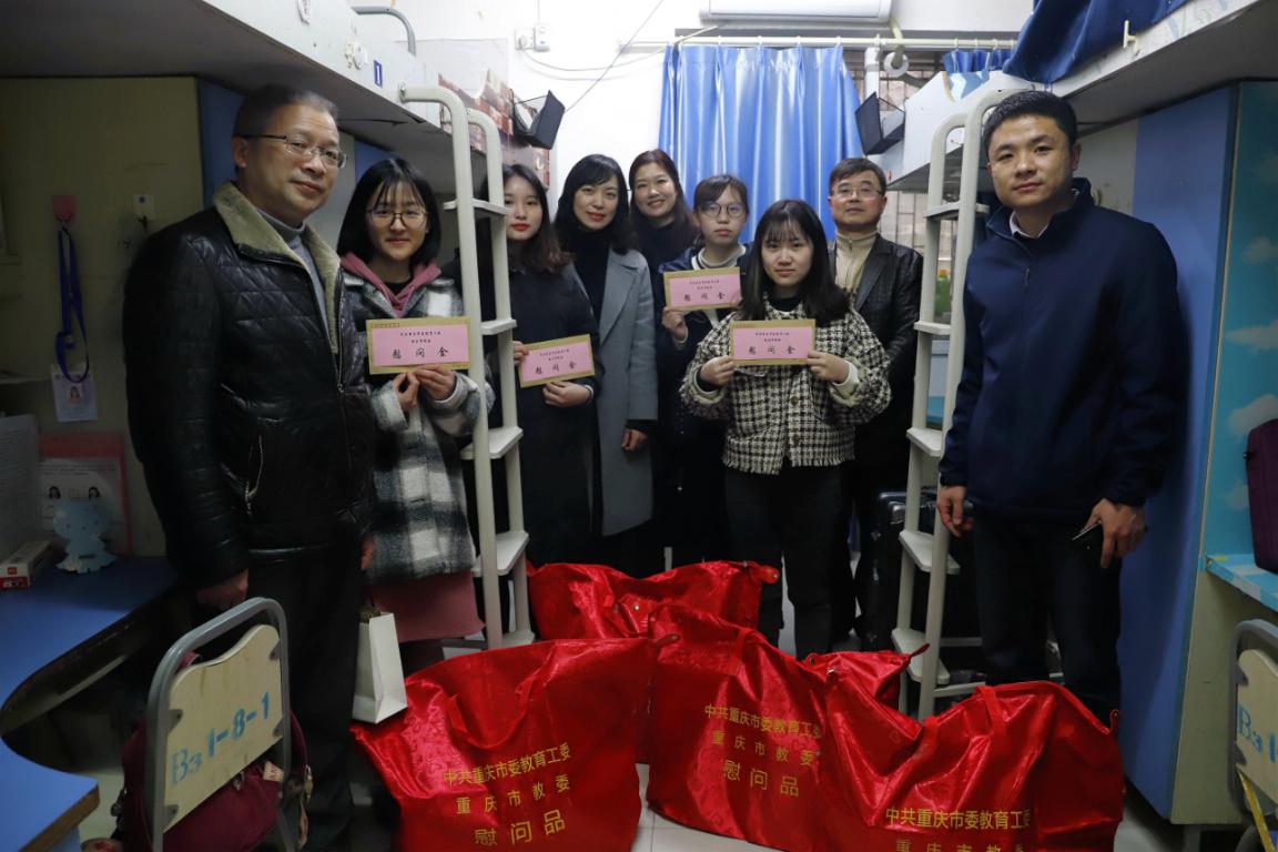 江燕副处长一行向金年会部分留校学生赠送了慰问金及新春大礼包等慰问品并与大家合影留念。金年会学生处相关负责同志陪同看望。