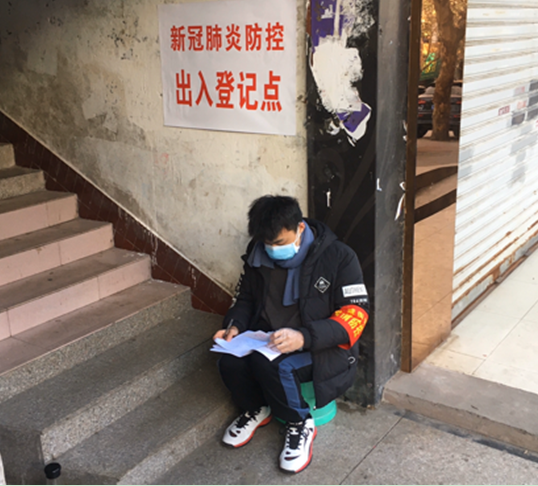 “在保护自己的同时,也要保护国家。”来自18级机电一班的李新洪同学,主动报名参加重庆市开州区汉丰街道金州社区疫情防控工作。从早上八点到下午五点,他冒着寒风坐在指定小区的门口对进出的小区成员有序地进行登记,并给他们发放通行证,以此来限制小区各家人户出行的人数和次数。在登记和发放通行证时会给小区业户们讲清楚通行证的作用以及现在疫情的情况,希望他们能够理解并支持工作进展。中午简单解决了午饭后继续回到岗位上进行登记。他说,要把握好每个时间段进出的人数,能够少出去一个人就是对国家做出了贡献,我的力量虽然微薄,但是我也要贡献给国家。