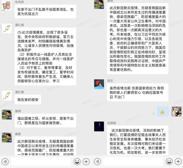 2月23日,习近平总书记在统筹推进新冠肺炎疫情防控和经济社会发展工作部署会议上的重要讲话引起了强烈反响。为贯彻落实习总书记把疫情防控工作作为当前重中之重这一战略部署,2月27日下午,习近平新时代中国特色社会主义思想学生研习团召开了“青春同行,并肩战‘疫’”线上主题团日活动。