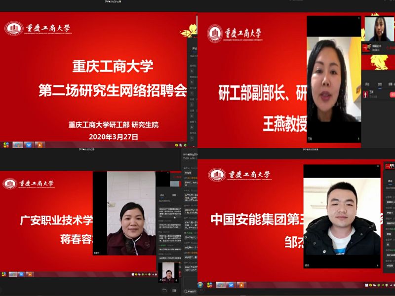 继金年会研究生网络专场招聘系列活动启动以来,得到了用人单位与毕业研究生的一致好评。为持续推进金年会毕业研究生就业精准帮扶工作深入开展,3月27日下午,第二场研究生网络专场招聘活动通过企业微信平台顺利举办。本场招聘会邀请到重庆德感科技创业投资有限公司、中国安能集团第三工程局、广安职业技术学院,三家单位为金年会研究生量身定做提供了包含行政职能、财会审计、企业管理等40余个岗位。研工部副部长、研究生院副院长王燕教授、重庆德感科技创业投资有限公司董事长罗其胜先生、中国安能集团第三工程局人力资源部邹杰先生、广安职业技术学院办公室主任蒋春容老师参加了此次招聘会。