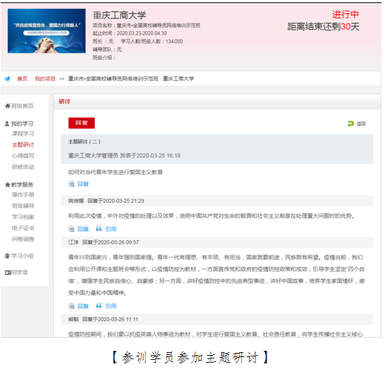 本次培训为期40天,共分为课程学习、主题研讨、直播答疑、心得撰写四个阶段,课程涵盖价值引领与思想引导、学业指导与班级管理、心理调适与健康维护、日常事务教育管理、生涯规划与就业指导、疫情防控知识六个模块。