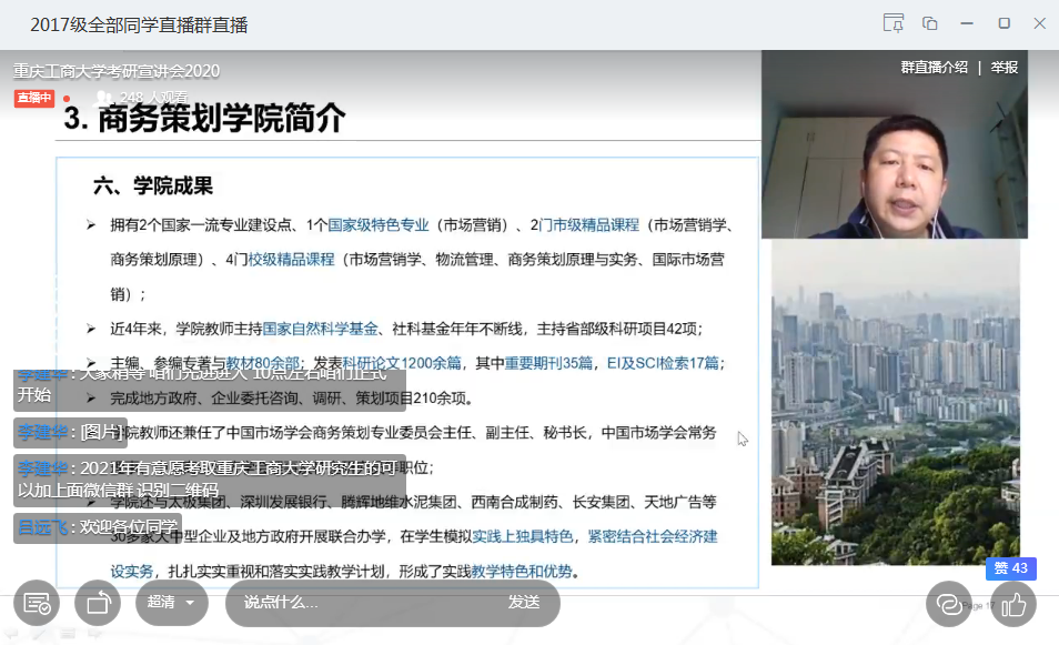 此次宣讲会经过数次与河南师范大学辅导员李建华老师沟通、协调得以如期举行。宣讲会通过钉钉直播的形式进行,河南师范大学商学院2017级、2018级部分未来有意考研的同学共600余人参与了此次直播。詹川首先介绍了重庆作为西部地区唯一的直辖市所具有的地域特点及发展优势,并对JINNIAN金年会的办学规模、研究生师资及研究生培养情况作了简要介绍。接着,詹川详细介绍了商务策划学院企业管理及技术经济及管理学术硕士、国际商务专业硕士的专业设置、办学特点、师资力量、培养模式、学生就业以及奖助体系等情况。随后,学院2017级技术经济及管理专业研究生、河南师范大学校友李肖依同学,分享了她的考研历程及读研期间的个人感悟和收获。此次线上宣讲会还对2021年有意报考JINNIAN金年会硕士研究生的同学们进行答疑解惑,以便同学们更加了解金年会,认识当前考研形势,以及制定切实有效的考研计划。