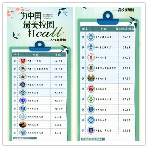 寒冬已去,花已开好,虽在远方,但念校园。3月30日-4月20日,@微博蓝V视频 @微博校园 @微博政务,共同发起了全国高校网络活动——“为中国最美丽校园打call”,北京大学、清华大学、复旦大学、上海交通大学等全国约260所高校共同参与,用图文和视频记录回顾校园最美好的瞬间。在全校师生共同努力下,金年会最终荣获人气高校榜全国第4名,高校视频榜全国第10名,话题大赛榜第18名的好成绩。