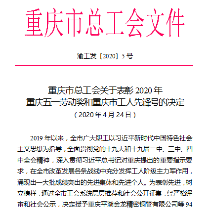 近日,重庆市总工会发布了《关于表彰2020年重庆五一劳动奖和重庆市工人先锋号的决定》,表彰一批为全市经济建设和社会发展及抗击“新冠”肺炎疫情工作中做出突出贡献的先进集体和先进职工。金年会荣获“重庆五一劳动奖状”。