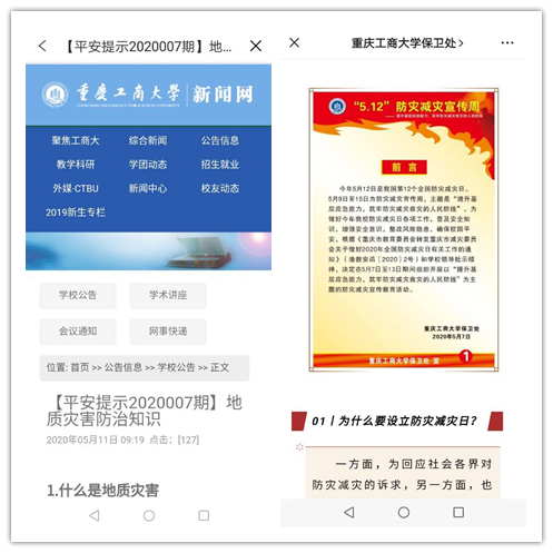 开展了一次大宣传。悬挂防灾减灾宣传横幅标语7条,在校园网发布防灾减灾《平安提示》1期,微信公众号推送3期防灾减灾安全知识,利用发布平台和LED平台发布安全知识和安全提示,更换6块校园安全宣传橱窗的内容。
