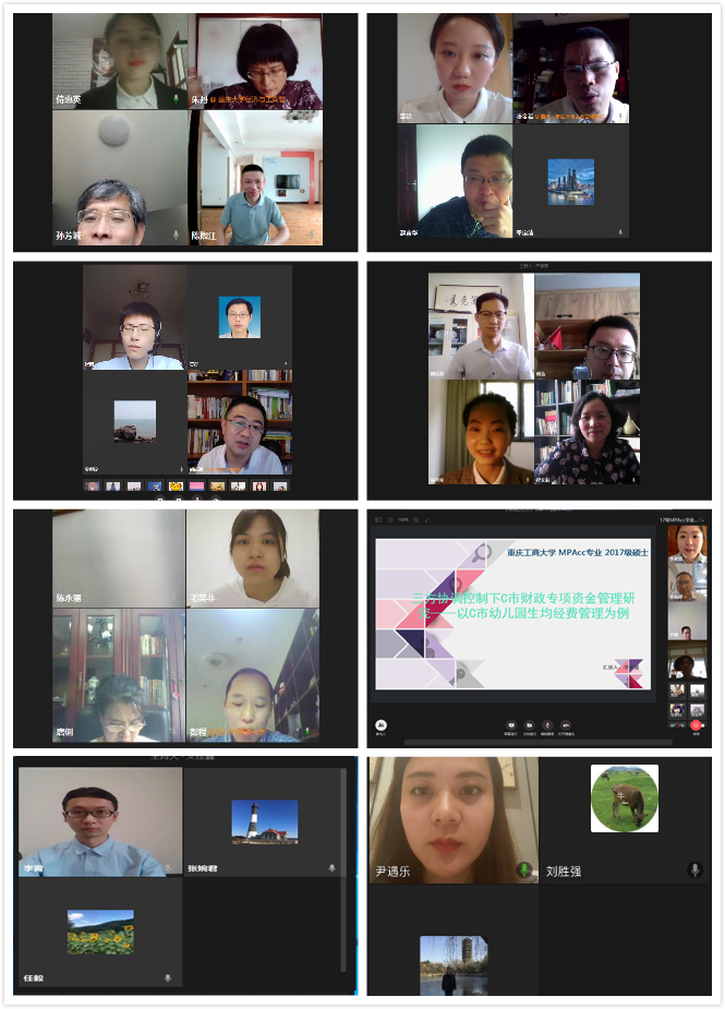 首先,宣布答辩规则。由答辩组长报告答辩委员会组成、答辩人情况、宣读答辩规则并宣布答辩开始。随后,学生陈述论文。同学们答辩准备认真充分,答辩PPT制作精美用心,在答辩过程中论述清晰、流畅。同学们的论文紧跟会计研究前沿热点,包括自然资产离任审计、财务共享、股权质押、环境审计、高送转、业绩承诺、内部控制、供应链金融、并购管理等方面。第三,答辩委员提问。答辩专家秉承严谨细致、认真负责的学术态度,认真倾听同时做好记录,在答辩人报告完毕后提出问题,并从论文的规范性、逻辑性、文献综述、论文边际贡献、案例研究方法、论文严谨性和创新性提出修改意见。答辩委员们所提出的问题发人深省,修改意见对于同学们的论文来说均是点睛之笔。第四,专家评分。所有同学陈述及回答完毕后退出会议室,答辩委员会委员对答辩过程与结果进行评议并进行线上评分。最后,答辩总结。各答辩人和观摩者重新进入会议室,由答辩组长对答辩情况进行总结并宣布答辩结束。两天的远程视频答辩在紧张严肃的氛围下圆满结束。