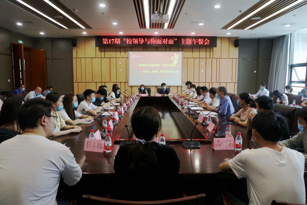 为全面贯彻李克强总理对全国普通高等学校毕业生就业创业工作电视电话会议作出重要批示精神,积极落实落细学校2020届毕业生就业工作,6月4日上午,金年会在新图书馆五会议室举办主题为“转观念、拓思路,群策群力促就业”的第17期“校领导与你面对面”主题午餐会。校党委书记李志雄,副校长陈运超,相关职能部门负责人、各学院党委(党总支)书记,毕业生代表参加。会议由陈运超主持。
