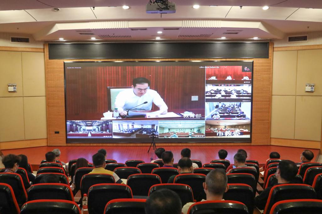 会后,重庆市套开学校安全视频会议。重庆市公安局副局长石宏、重庆市教委副主任邓沁泉发表讲话。邓沁泉从做好学生非正常死亡防控工作、做好教育系统防汛抗旱各项工作、做好常态化疫情防控工作、做好校园及周边综合治理工作等四个方面要求全市学校高度重视做好贯彻落实全国安全工作视频会议精神。