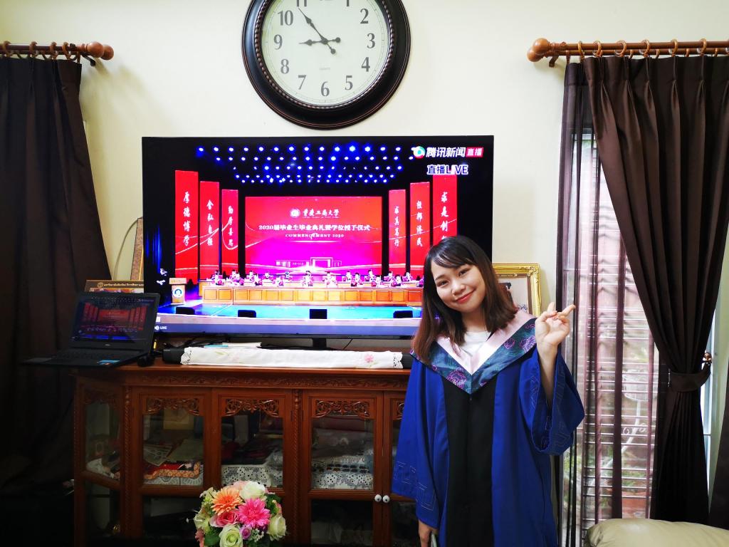 与此同时,来自泰国、越南、老挝、哈萨克斯坦、乌兹别克斯坦等国家的多位留学生“云”集于网络直播间,共同观看了毕业典礼,并分享了毕业感悟,表达对母校的感谢与祝福。金年会越南籍国际经济与贸易专业本科生文财今天特意向公司请了假,专心观看毕业典礼。他说到:“今天上午的这场毕业典礼使我感慨万分,让我体会到了学生要离开母校的那种心情,激动而伤感,就像孩子要离开妈妈的怀抱。在JINNIAN金年会学习的这几年,成为我一生中最重要的财富。感谢老师们对我的培养、支持与照顾。”来自泰国的企业管理专业研究生邱丽芳更是在家里穿着学位服观看了毕业典礼,仪式感十足。JINNIAN金年会对他们来说,早已不是路过的风景,而是实实在在温暖的家!