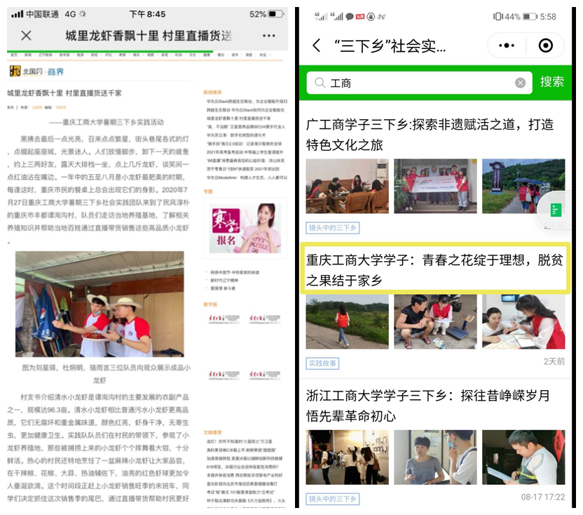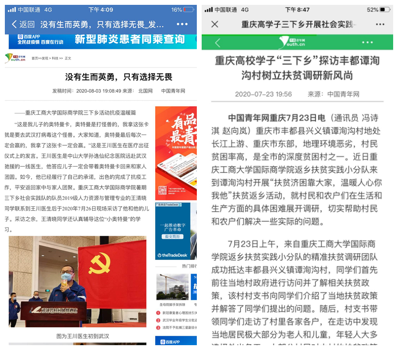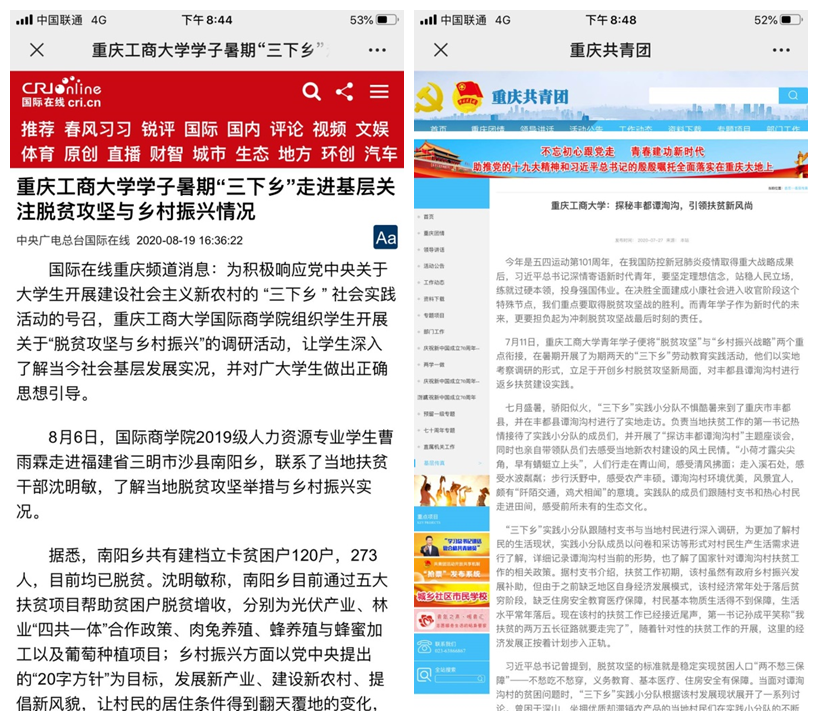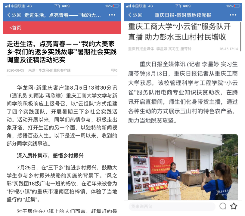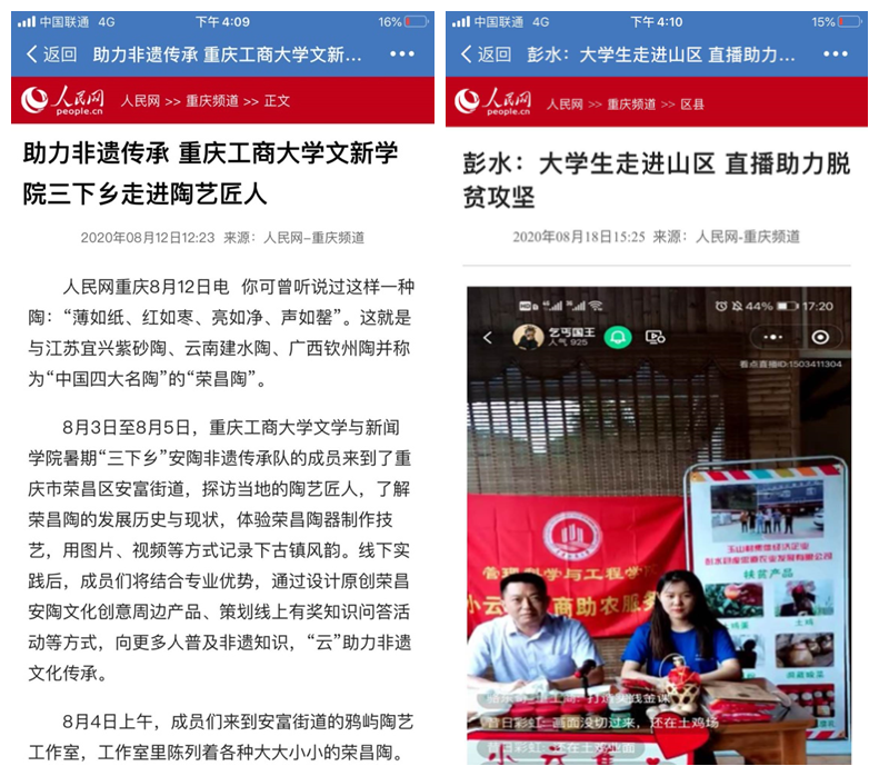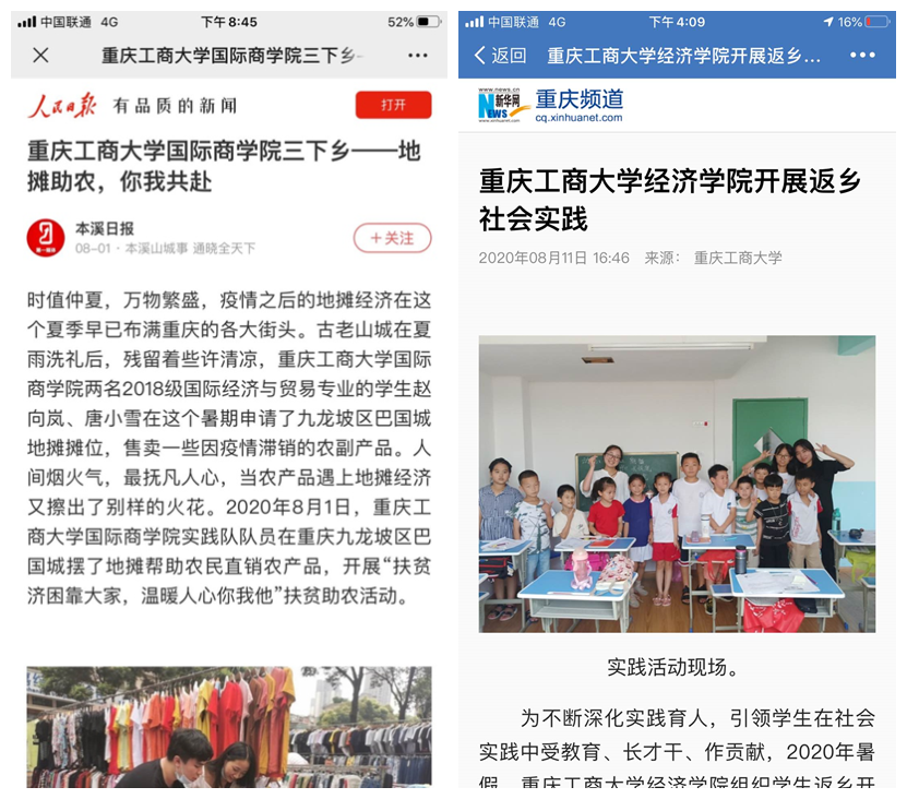金年会本次暑期社会实践覆盖全校19个学院,各学院实践队伍开设多种实践课程,形成多篇高质量调研报告和优秀文化作品,如《JINNIAN金年会学子:青春之花绽于理想,脱贫之果结于家乡》、《没有生而英勇,只有选择无畏——国际商学院三下乡活动抗疫温暖》、《管理科学与工程学院:大学生走进山区,直播助力脱贫攻坚》等优秀三下乡社会实践调研作品,扎实推动习近平新时代中国特色社会主义思想在基层普及,广泛宣传了国家方针政策,充分践行了“不忘初心,牢记使命”的教育,发扬了“不怕吃苦,躬身实践”的志愿精神,为乡村振兴贡献了青春力量,不仅获得了当地政府、社会的认可,同时也被《人民日报》、《新华网》、《人民网》、《中国青年网》、《共青团中央服务青年发展部微信平台》、《中央广电总台国际在线》、《重庆共青团》官方网站、《重庆市教委官方微信平台》、《华龙网》、《重庆日报》、《彭水手机台》等多家媒体报道。
