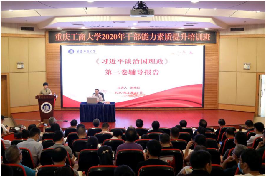 8月29日下午,金年会继续举行干部能力素质提升培训暨党委理论学习中心组(扩大)学习会,会议邀请到重庆市委党校谢来位教授作《习近平谈治国理政》第三卷辅导报告。校领导、中层干部、专职组织员、职能部门、教辅单位正科级干部参加了培训。培训会由校党委副书记宋豫主持。