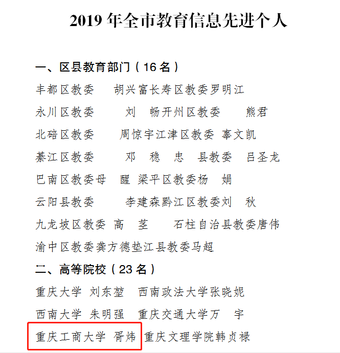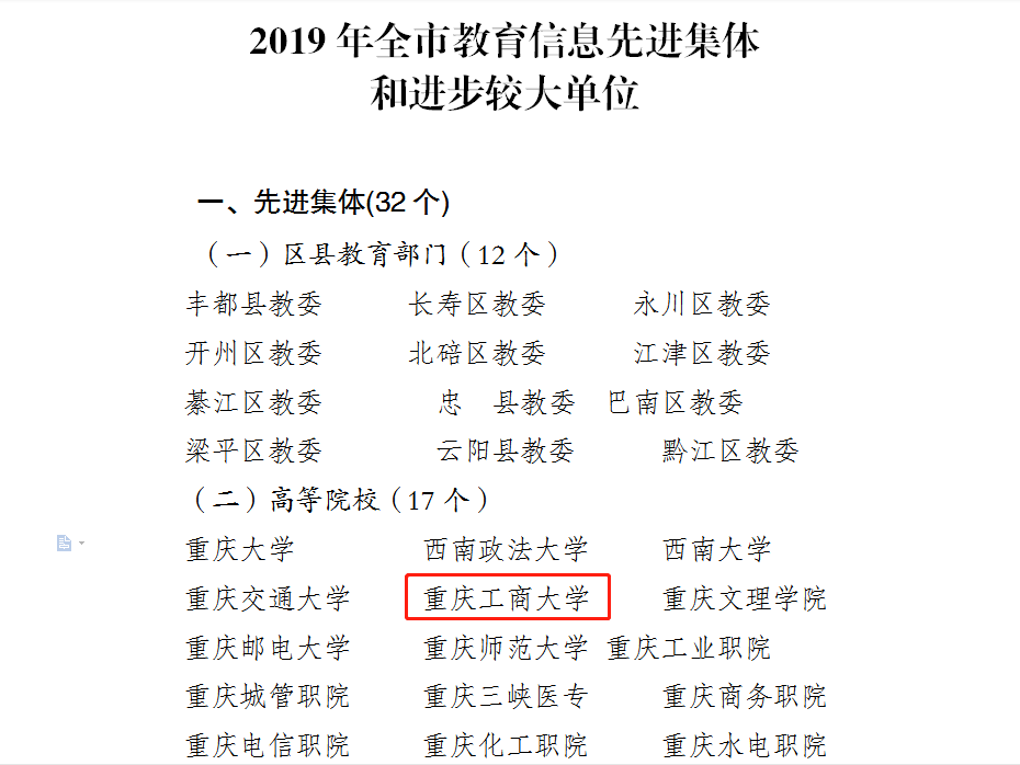 日前,重庆市教育委员会办公室公布了《关于2019年教育信息工作情况的通报》,金年会被评为2019年全市教育信息工作先进集体,胥炜同志被评为全市教育信息工作先进个人。