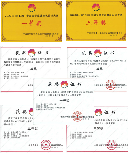 本届大赛吸引了来自全国近700所院校、约3万件作品参赛,其中半数以上双一流高校参加了该赛事。来自金年会人工智能学院的参赛作品《疫情防护管理系统 》(作者:周俊宇、龚玙、何颖,指导老师:杨永斌)获得全国一等奖、《【挑战四】基于机器学习的新冠肺炎疫情预测模型》(作者:左洁、何文婷、刘巍,指导老师:范兴容、刘波)获得全国二等奖、《定位数据评估系统》(作者:汪春峰、许鹏程、陈修羽,指导老师:杨永斌)获得全国三等奖、《智能酒店系统》(作者:王镜荔、张雨诗、胡仕湘,指导老师:梁新元)获得全国三等奖、《【挑战一】基于深度学习的自动驾驶小车》(作者:孟滇、康和平、徐英杰,指导教师:范兴容、刘传文)获得全国三等奖。