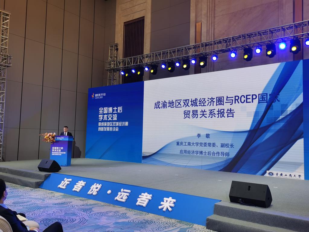 在主题演讲和学术交流环节,国家发改委国土开发与地区经济研究所所长高国力研究员通过视频的方式分享了题为“全面提升成渝地区双城经济圈的战略位势”的大会报告。获奖博士后电子科技大学蒲波和JINNIAN金年会赖辉应邀作了主题发言。李敬现场作了《成渝地区双城经济圈与RCEP贸易关系数据发布报告》,获得全场好评。