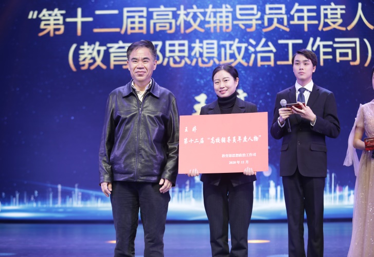 王婷作为全国辅导员年度人物发表感言。她从教师、辅导员两个角色谈了自己在不同角色中围绕“立德树人”核心的体会和感想,表示将在日常辅导学生中,为落实立德树人的根本任务,必须将价值塑造、知识传授和能力培养三者融为一体,全面推进课程思政建设就是要寓价值观引导于知识传授和能力培养之中,展现寓道于教、寓德于教、寓教于乐的辅导培育方针。