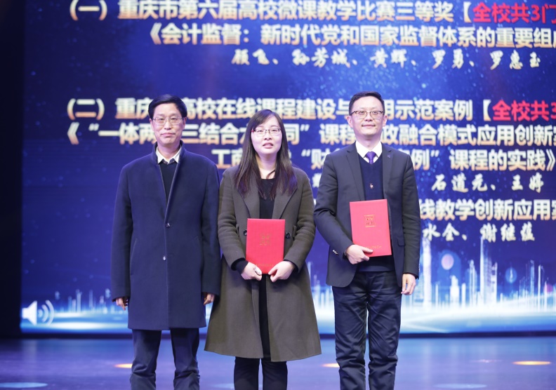 李志雄向会计学院辅导员王婷颁发了全国辅导员年度人物奖牌,宋豫向获评“会计之星”的学生颁发了奖状和奖杯,陈兴述向会计学院教师顾飞和蒋秋菊颁发了重庆市第六届高校微课教学比赛三等奖证书,相关职能部门领导为校级以上获奖的教师颁发奖状。罗惠玉分别为党建工作积极分子代表、宣传工作先进个人代表、学习强国优秀个人代表、党建工作“规范化,特色化”的先进集体颁奖。
