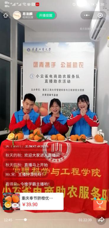 “民族要复兴,乡村必振兴”。响应习近平总书记在中央农村工作会议的号召,为巩固拓展脱贫攻坚成果,助力乡村振兴,管理科学与工程学院小云雀电商助农服务队携手共青团奉节县委在12月31日开展直播助农活动,帮助奉节贫困农户销售滞销脐橙。