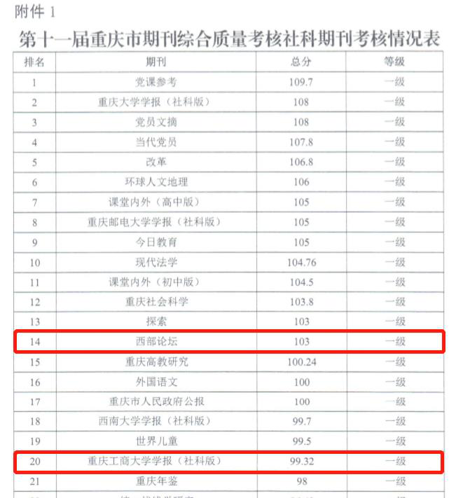 本次考核对象为全市所有正常出版的134种期刊,考核内容主要是2019年度和2020年度期刊出版情况,得分90分以上(含90分)的期刊为一级期刊。《西部论坛》《JINNIAN金年会学报(社会科学版)》分别得到103分和99.32分。