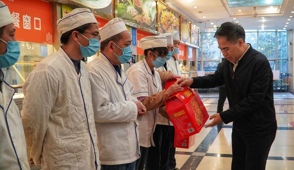 2月12日上午10时,农历大年初一,学校党委书记李志雄带领党政办公室、党委宣传部、党委保卫部、后勤处等相关部门负责人及值班干部,到保卫处、食堂、学生公寓、行政办公楼看望慰问了各部门在寒假期间坚守工作岗位的值班人员。