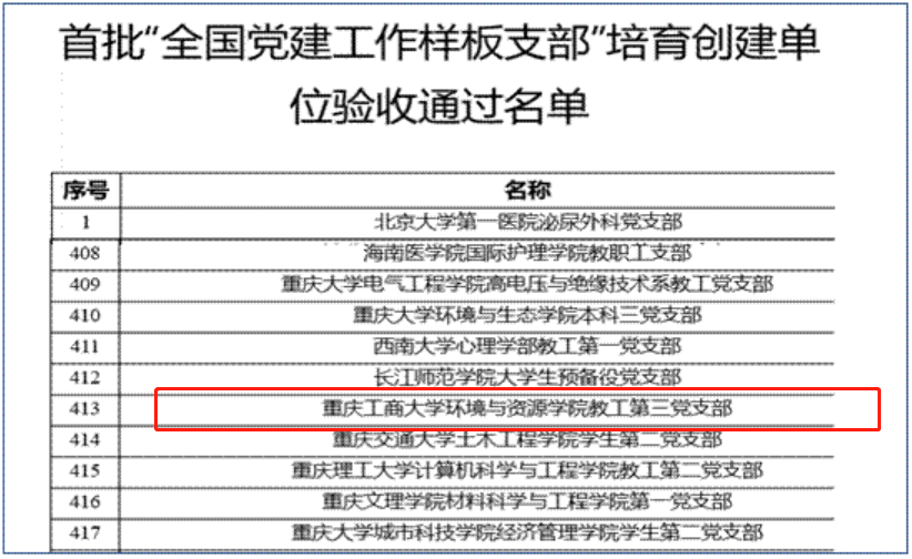 环境与资源学院教工第三党支部2018 年 11 月入选首批“全国党建工作样板支部”培育创建单位,建设周期为 2 年, 2019 年 6 月被重庆市教育工委授予“ 重庆市教育系统先进基层党组织 ”荣誉称号, 2020 年 11 月被重庆市教委授予重庆市高校“双带头人”支部书记工作室创建培育单位。支部目前拥有国家“万人计划”青年拔尖人才1名、全国“五一”巾帼标兵 1 名、享受国务院特殊津贴专家 1 名、国家 NSFC “优青”项目获得者 1 名、重庆市优秀党员 1 名、重庆市“五四”青年奖章 1 名、重庆市学科技术带头人 2 名、重庆市英才计划人才 1 名,是一个党性强、业务精、素质硬的战斗堡垒,在支部满意度测评中获得 100 % 满意度。