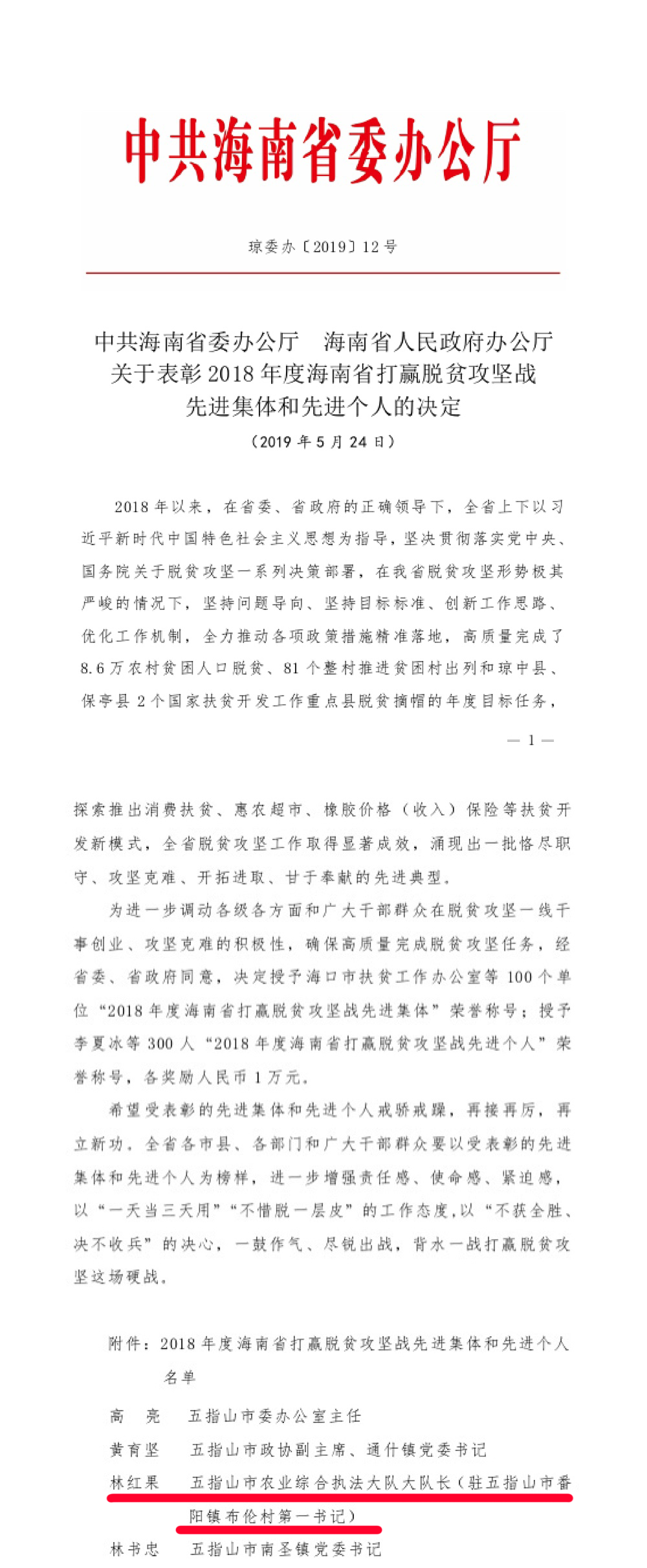 林红果于2017年3月至2019年9月由海南省五指山市农业局派驻海南省五指山市番阳镇布伦村担任驻村第一书记,2019年9月转任海南省五指山市番阳镇布伦村脱贫攻坚战斗中队中队长。他自2017年3月至今一直奋斗在脱贫攻坚一线,为国家的脱贫攻坚工作贡献力量。