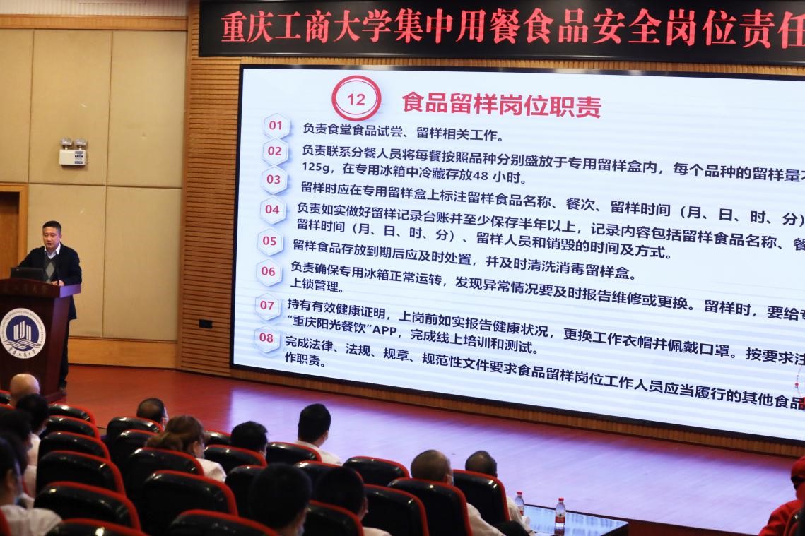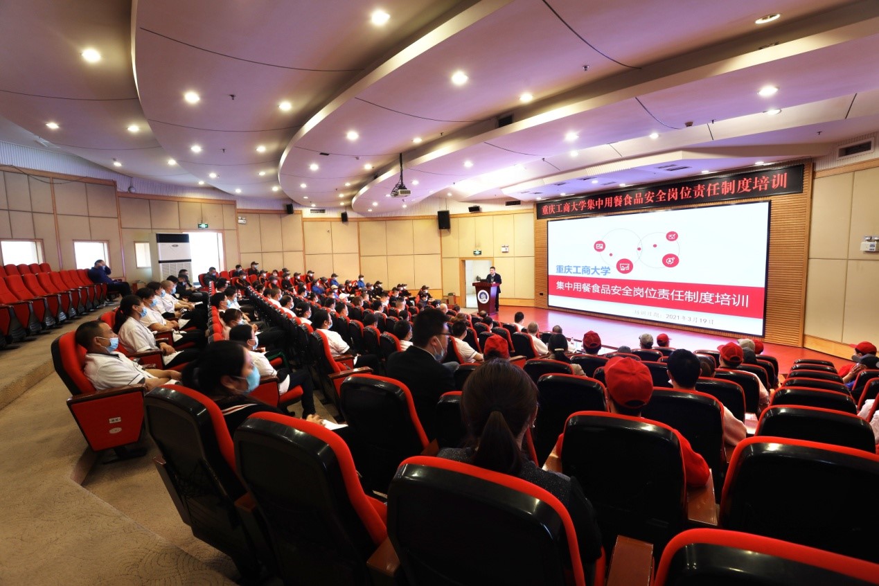 为保障学校师生食品安全,健全食品安全管理制度,明确食品安全工作责任,加强食品安全管理,根据《重庆市市场监督管理局 重庆市教育委员会关于建立学校及幼儿园集中用餐食品安全岗位责任制度的通知》(渝市监发〔2021〕14号)要求,金年会于3月8日召开校长办公会,讨论通过了《JINNIAN金年会集中用餐食品安全岗位责任制度》,将上级部门对校园食品安全要求进行细化、分解,明确从校长到一般食品安全从业人员等相关责任人员的食品安全工作任务;对校园食品安全主体责任、第一责任、主要责任、直接责任等进行清晰地界定,确保做到责任落地、落实。3月19日下午,金年会在博智楼7200报告厅召开培训会,后勤处处长沙云对《JINNIAN金年会集中用餐食品安全岗位责任制度》逐条、逐项并结合案例进行培训讲解,要求每个岗位做到人人知晓、责任清楚、任务明确。后勤处饮食科,校内各餐饮公司负责人、幼儿园负责人、各食堂经理、各食堂班组骨干人员等200余人参加了培训会。