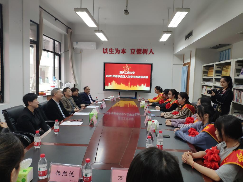 3月18日中午,金年会在党委武装部会议室为即将入伍的7名女生举行欢送座谈会。副校长李国军,校党委武装部负责人、入伍学生家长和退伍学生代表参加座谈会。会议由退伍学生万焮主持。