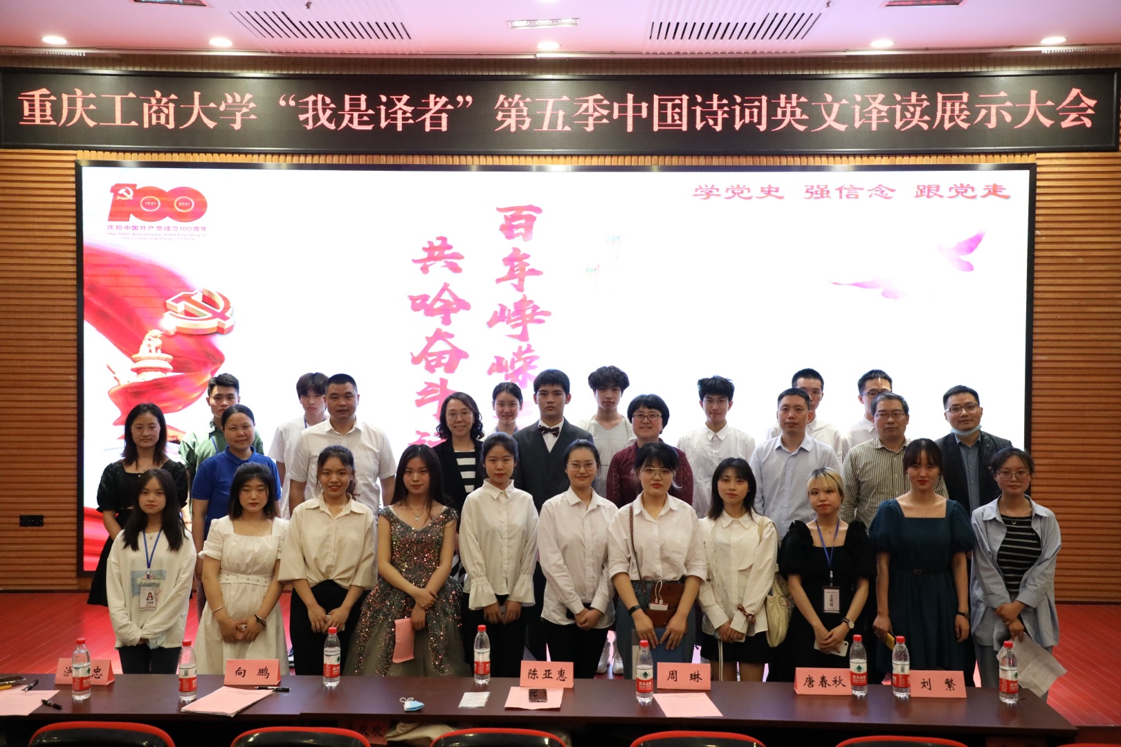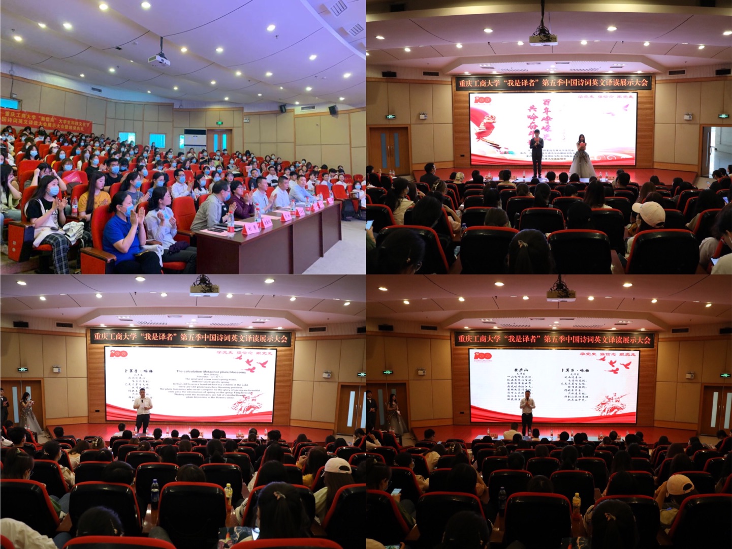 4月30日下午,由校团委主办,外国语学院分团委学生会、外国语学院党员服务站、英语协会联合承办的“百年峥嵘史,共吟奋斗诗”第五季中国诗词英文译读展示大会暨颁奖典礼在南岸校区博智楼7200报告厅成功举行。党委学生工作部副部长陈亚惠、校团委基层组织建设部部长陈琛、外国语学院党委书记唐春秋、院长周琳、党委副书记吴欢欢、副院长刘繁、分团委指导教师丁亮,以及近300名学生代表参加了本次活动。本次活动首次采用双导师点评的方式,外国语学院英语系教师向鹏从专业角度点评翻译技巧和意境,马克思主义学院中国近代史纲要教研部主任洪富忠为同学们讲解党史诗词的背景和历史故事。