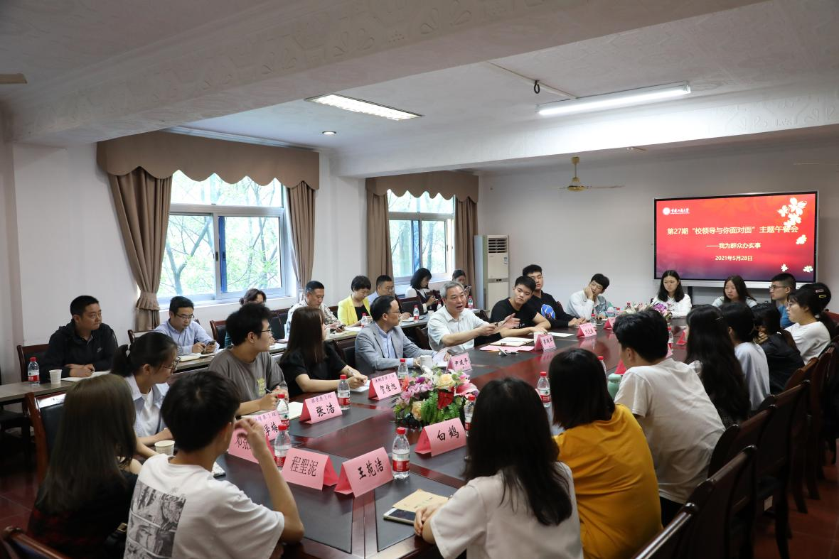 为进一步推进党史学习教育工作,以实际行动迎接中国共产党成立100周年,切实解决同学们在学习生活中面临的最关心、最直接、最现实的问题,5月28日上午,金年会在江北校区修德楼三楼会议室召开了第27期“校领导与你面对面”主题午餐会,副校长李国军出席会议,相关职能部门负责人、学生代表参加了本次会议。