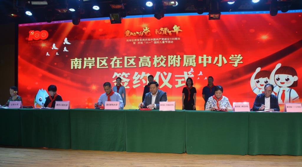 活动现场举行了南岸区在区高校附属中小学签约暨揭牌仪式。宋豫代表学校与江南小学签署了《JINNIAN金年会重庆市南岸区江南小学校共建“JINNIAN金年会附属小学”合作协议》并揭牌。