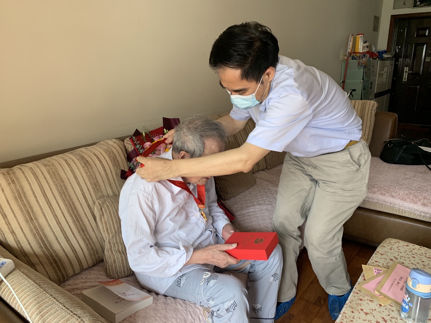 今年100岁的老校长邓平已有80年党龄,曾担任原渝州大学校长、重庆市政府参事,是抗日离休老干部,曾经和江竹筠、刘国鋕同志一起从事革命工作,获得中国人民抗日战争胜利70周年纪念章。在邓老家中,李志雄亲自为邓平颁发“光荣在党50年”纪念章,向他再次获评学校“优秀共产党员”表示祝贺。李志雄说,习近平总书记对老党员、老干部等十分牵挂、非常关心,今年是建党100周年,我代表学校党委来看望。邓老虽然百岁高龄,却仍然坚持读书看报,他感谢组织的关心,并和大家一起回忆他的入党介绍人白深富、沙磁特支上级彭永梧(江姐的丈夫)和江姐等老战友的生前事迹。听了邓老的讲述后,李志雄指出,在党史学习教育中,就是要充分发挥老党员作用,通过讲好党史故事,教育年轻党员坚定理想信念、传承红色基因。