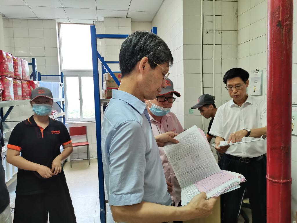 孙芳城一行认真查看了筱园食堂一、二、三楼原材料库房、精粗加工间、菜品售卖间、清洗消毒间等处,仔细翻阅了食堂食品采购的索证索票和质量检验报告,详细询问了食品安全工作流程、学生的就餐、消防安全的预防和管理等情况。
