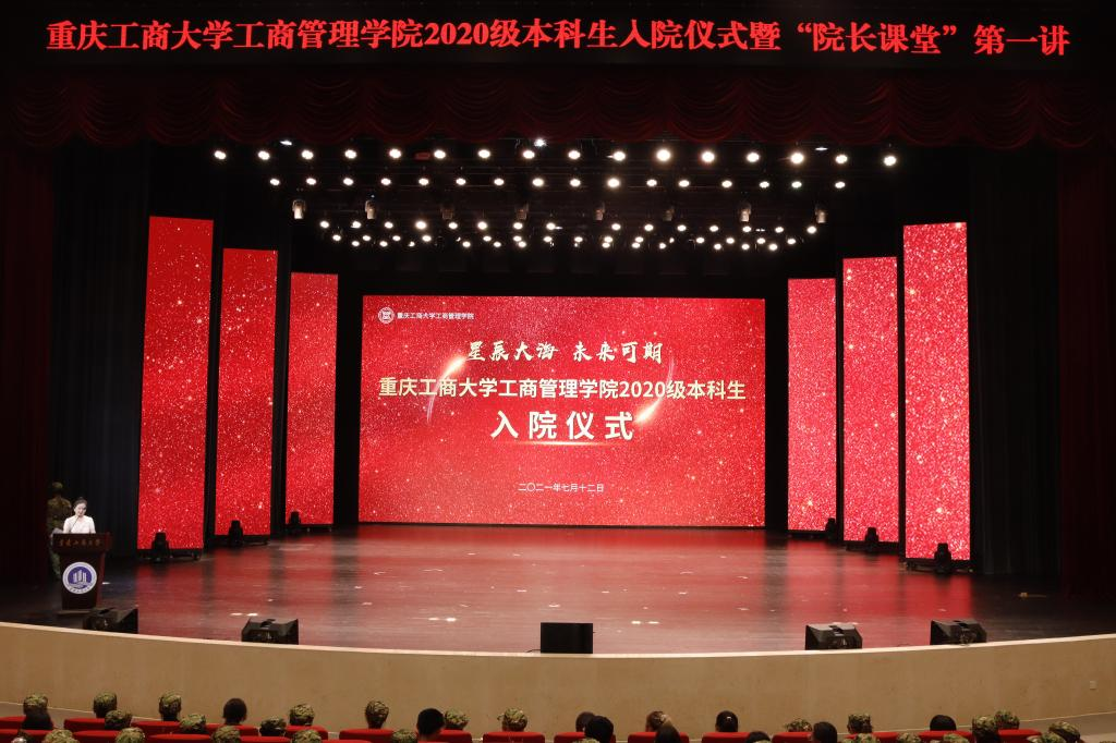 7月12日,工商管理学院在南岸校区剧场举行2020级本科生入院仪式暨“院长课堂”第一讲。工商管理学院党委书记彭勇,党委副书记、院长杨柏,党委副书记郭敏,副院长邱继勤、陈伟,教职工代表和2020级全体本科生参加了仪式。仪式由郭敏主持。