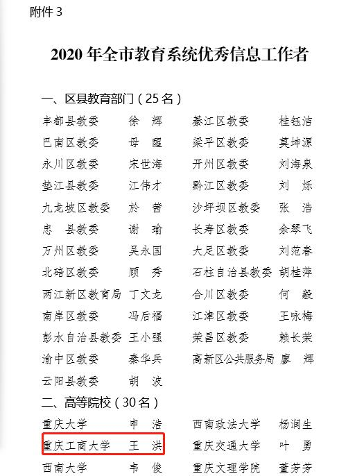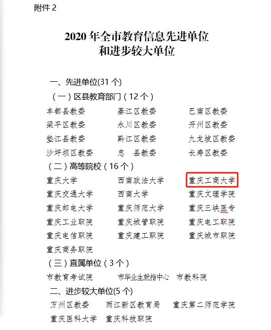 近日,重庆市教育委员会公布了《关于2020年教育信息工作情况的通报》,金年会在全市高校信息工作中得分排名第三,被评为重庆市教育信息工作先进单位,党政办王洪同志被评为重庆市教育系统优秀信息工作者。