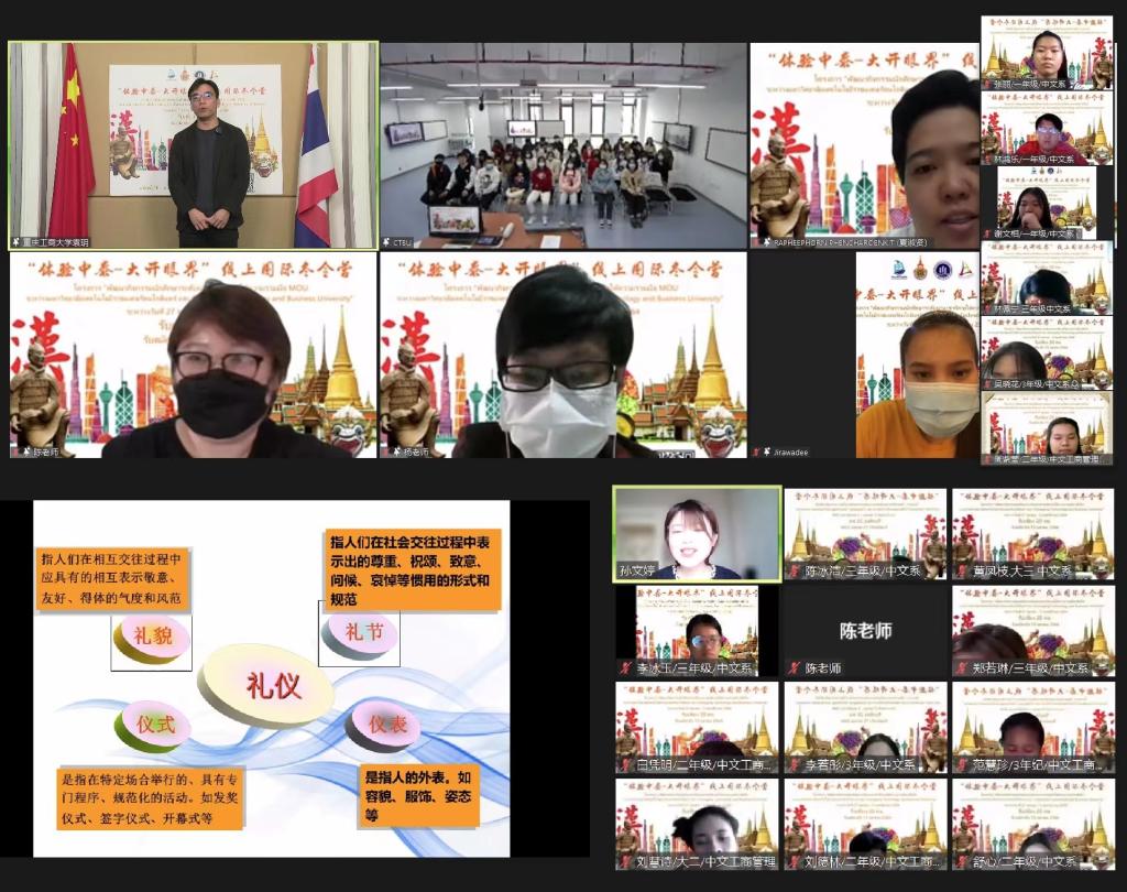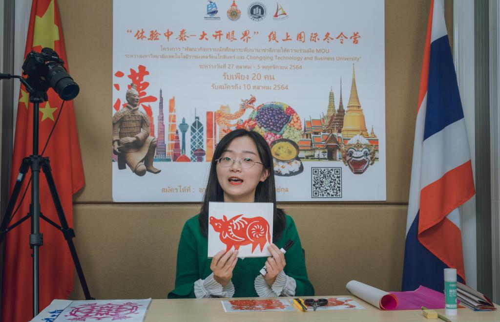 为期10天的活动中,中国学生在全新的“多屏互动多媒体教室”里,体验了别有风情的泰国文化、欣赏了泰国非遗手工,学习制作了精致的泰国美食;泰国同学通过金年会为他们量身定制的“中国商务文化”系列线上课程学习了中国商务礼仪、电子商务等知识,体验了中国精美的剪纸文化,学习了中国武术等。