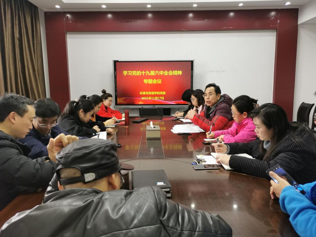 11月17日上午,环境与资源学院在慧智楼90609召开院党委理论中心组学习会,专题学习党的十九届六中全会精神。全体院领导、党委委员、综合办主任、工会主席、学工办主任、各支部书记、各系(中心)主任等20多人参加了会议。学院党委书记曾林主持会议。