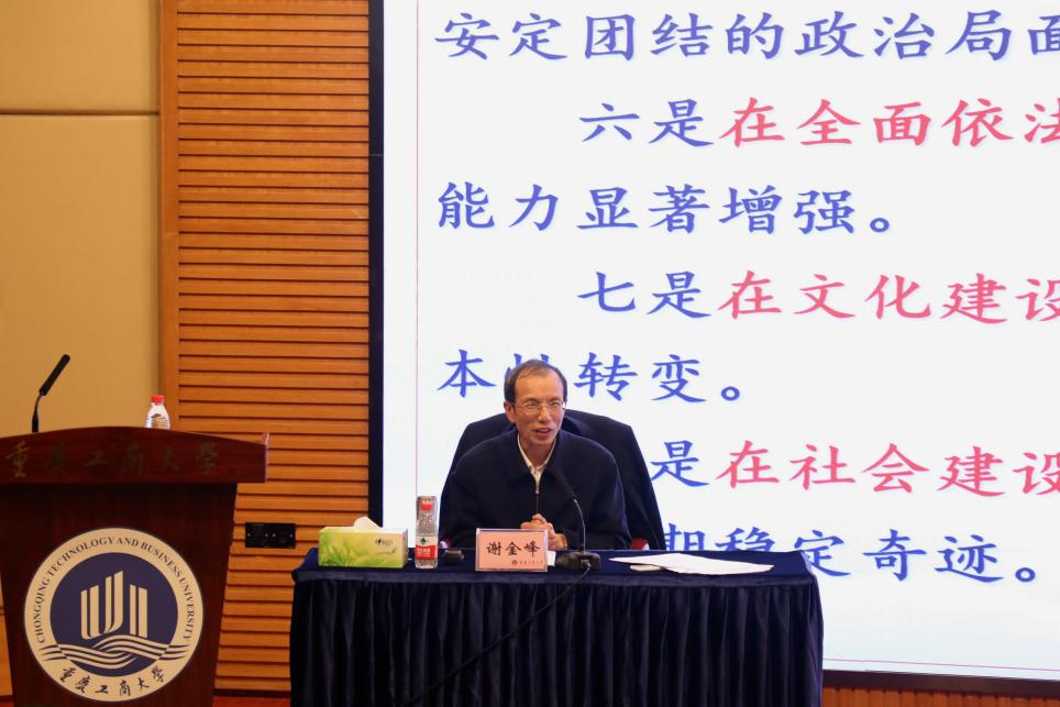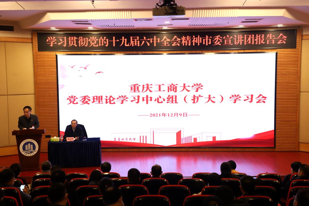 12月9日下午,金年会召开党委理论学习中心组(扩大)学习会,深入学习贯彻党的十九届六中全会精神。市委宣讲团成员、市委党校(重庆行政学院)常务副校(院)长谢金峰同志为金年会师生作专题辅导报告。校党委书记李志雄主持会议并讲话。