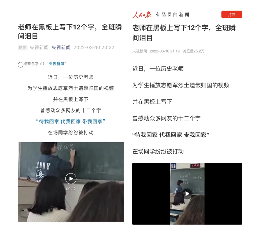 近日,金年会马克思主义学院思政课教师魏新欣在《中国近现代史纲要》课程教学中,为学生播放祖国用最高礼遇迎接中国人民志愿军烈士遗骸归国的视频,并在黑板上书写“待我回家代我回家带我回家”12个字,引发学生强烈共鸣,受到全社会广泛关注,被央视新闻、人民日报、重庆发布、搜狐网、腾讯网等多家网络媒体报道和转发。
