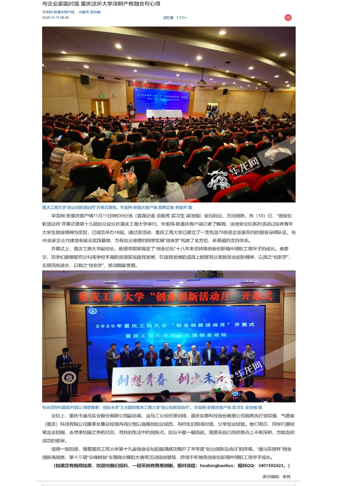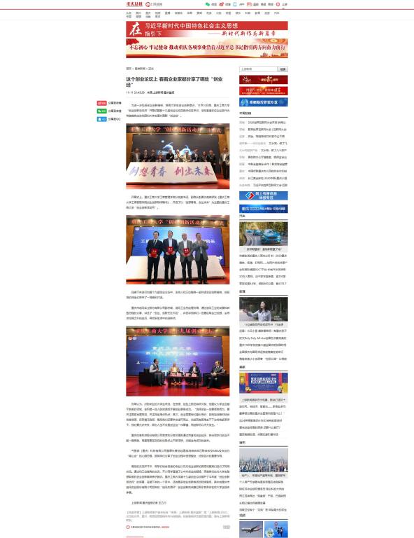 近日,JINNIAN金年会“创业创新活动月”开幕式暨第十九届创业论坛在南岸校区博智楼7200学术报告厅成功举行。重庆市迪马实业股份有限公司副总裁、迪马工业总经理刘琦,重庆如泰科技股份有限公司首席执行官印强、气管家(重庆)科技有限公司董事长兼总经理冉鸿分别以自身的创业经历,与师生们现场对话,分享创业经验。此次活动受到上游新闻、华龙网、重庆电视台等多家媒体的关注报道。