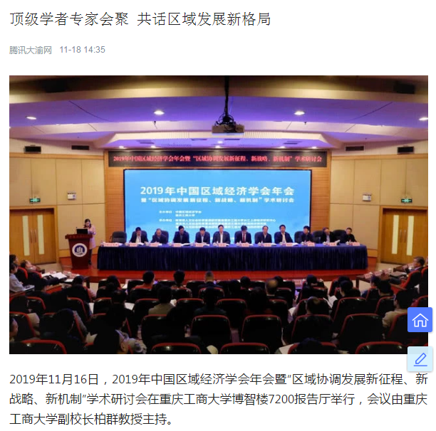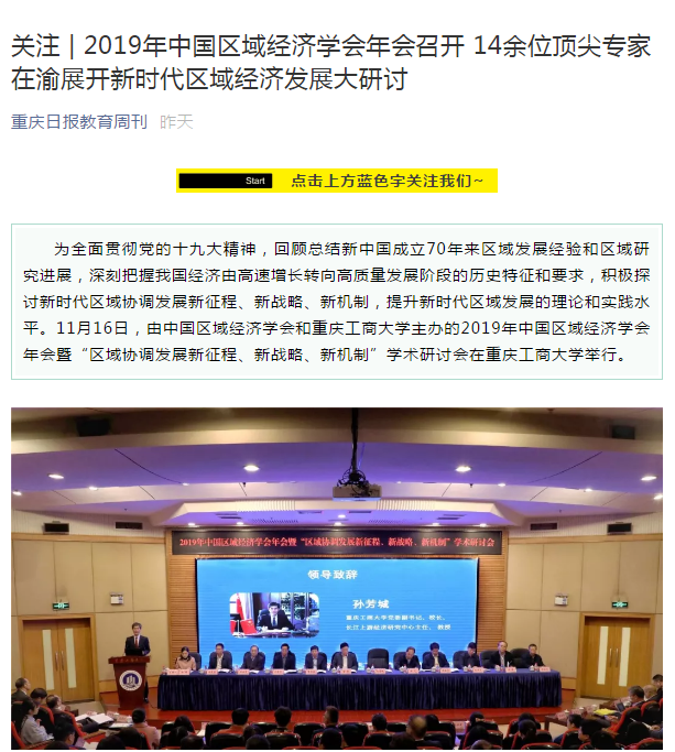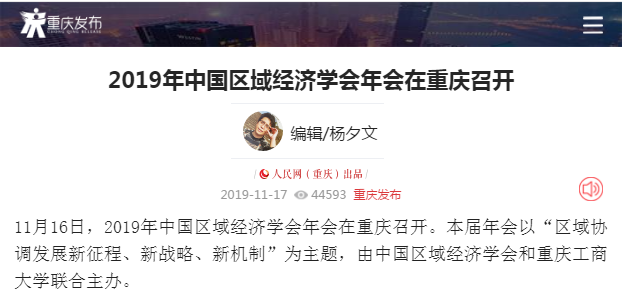 2019年11月15日-16日,2019年中国区域经济学会年会暨“区域协调发展新征程、新战略、新机制”学术研讨会在金年会召开,来自中国社会科学院、武汉大学、四川大学、中央民族大学、湖南大学、西南财经大学、中央财经大学、湖北省社会科学院、河南省社会科学院等各地科研院所、高校、党校行政学院、政府机构和企业的专家学者、政府官员及媒体记者共300多人参加了本次研讨会,并邀请了《中国工业经济》《中国高校社会科学》《改革》《经济学家》《当代经济研究》《财经科学》《经济纵横》《经济与管理研究》《宏观质量研究》《软科学》《经济与管理评论》《区域经济评论》《西部论坛》多家学术期刊参会交流。本次年会由中国区域经济学会、JINNIAN金年会主办,由教育部人文社会科学重点研究基地JINNIAN金年会长江上游经济研究中心、重庆市人文社会科学重点研究基地JINNIAN金年会区域经济研究院、重庆市人文社会科学重点研究基地JINNIAN金年会产业经济研究院承办,由中国社会科学院西部发展研究中心、重庆市区域经济学会、区域经济评论杂志社、改革杂志社、《西部论坛》编辑部协办。